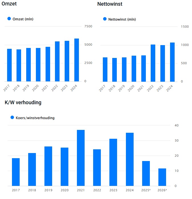 Wolters Kluwer rapporteert op 25 februari 2026 haar jaarcijfers over 2025. Deze analyse gaat vooral over de risico’s en kansen gerelateerd aan AI, toch is het goed kort het financiële overzicht te bekijken. De afgelopen jaren heeft de onderneming namelijk een gestage groei laten zien in onder andere de omzet, winstmarge, earnings per share en return on invested capital. Omzet in 2024 kwam uit op €5.9 miljard. De financiën van het bedrijf zijn dan ook de laatste jaren solide gebleken.