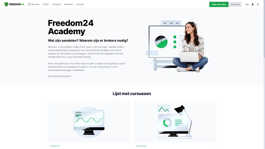 Wanneer je net begint met beleggen, is het aan te raden om het platform met vooral de Freedom24 Academy uitgebreid te verkennen. De Freedom24 Academy bevat verschillende lessen en cursussen, gericht op het ontdekken van de verschillende basisprincipes van beleggen, opties, handelen op nieuws en nog veel meer.