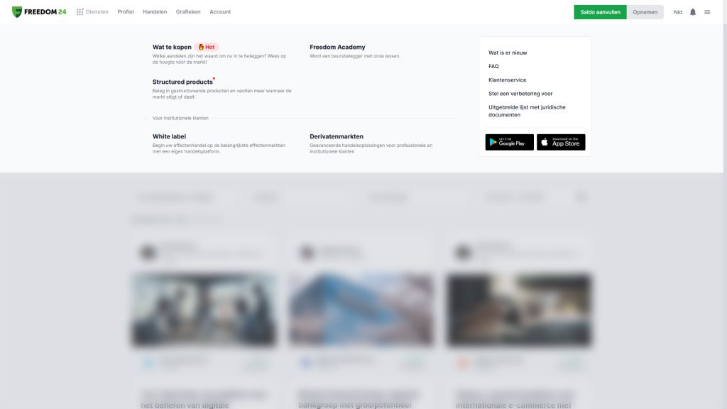 - Diensten: In deze sectie vind je diverse functies van Freedom24, zoals toegang tot de Freedom24 Academy met educatief materiaal, Wat te kopen-pagina waar analisten beleggingsideeën geven, marktoverzichten, aandelenadviezen, verschillende productgroepen, ETF’s, structured products en obligaties. Het is het kennis- en inspiratiegedeelte van het platform.