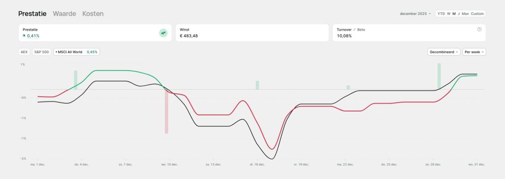 De laatste maand van een fantastisch beleggingsjaar. Geen eindejaarsrally deze maand, maar een lichte daling door winstnemingen en hernieuwde zorgen over de overwaarderingen in de techsector. Daarnaast verlaagde de FED de rente met 0,25%, wat beweging veroorzaakte binnen de financiële markten.